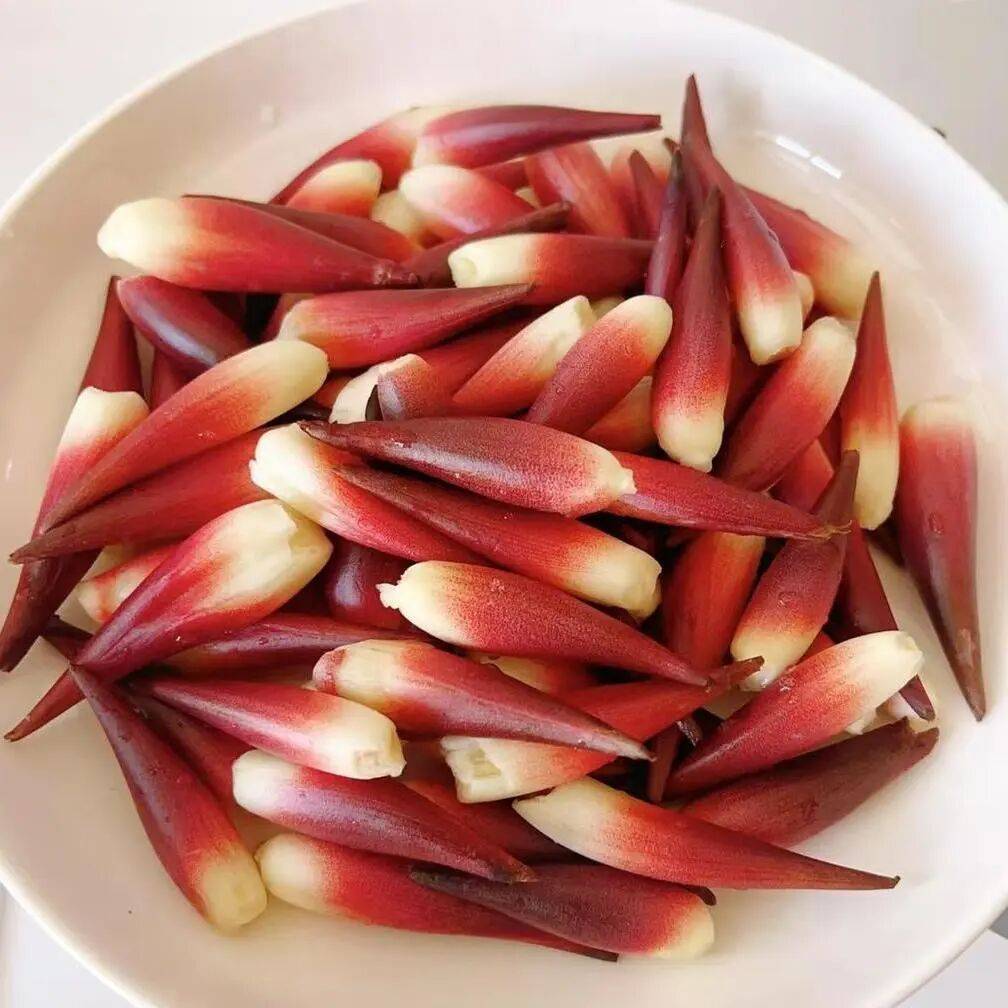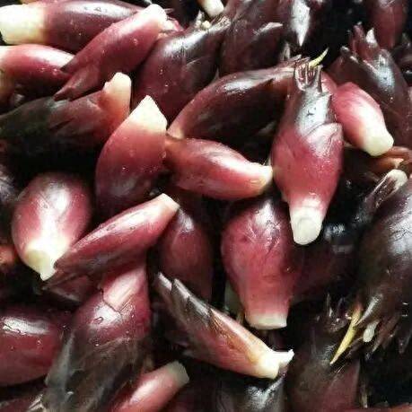 阳荷,也被称作山姜、观音花等,属于姜科姜属的直立草本植物,是中国特有的野生品种。它的花苞是主要食用部位,外形如同小竹笋,外层包裹着层层紫红色的瓣,远远望去,恰似火焰一般。