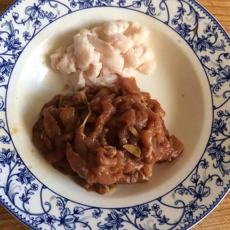 1. 将猪肉洗净后切片,注意肥瘦分开。把瘦肉用盐、酱油、糖、白胡椒粉、生姜丝、生粉抓匀,放置一旁备用。