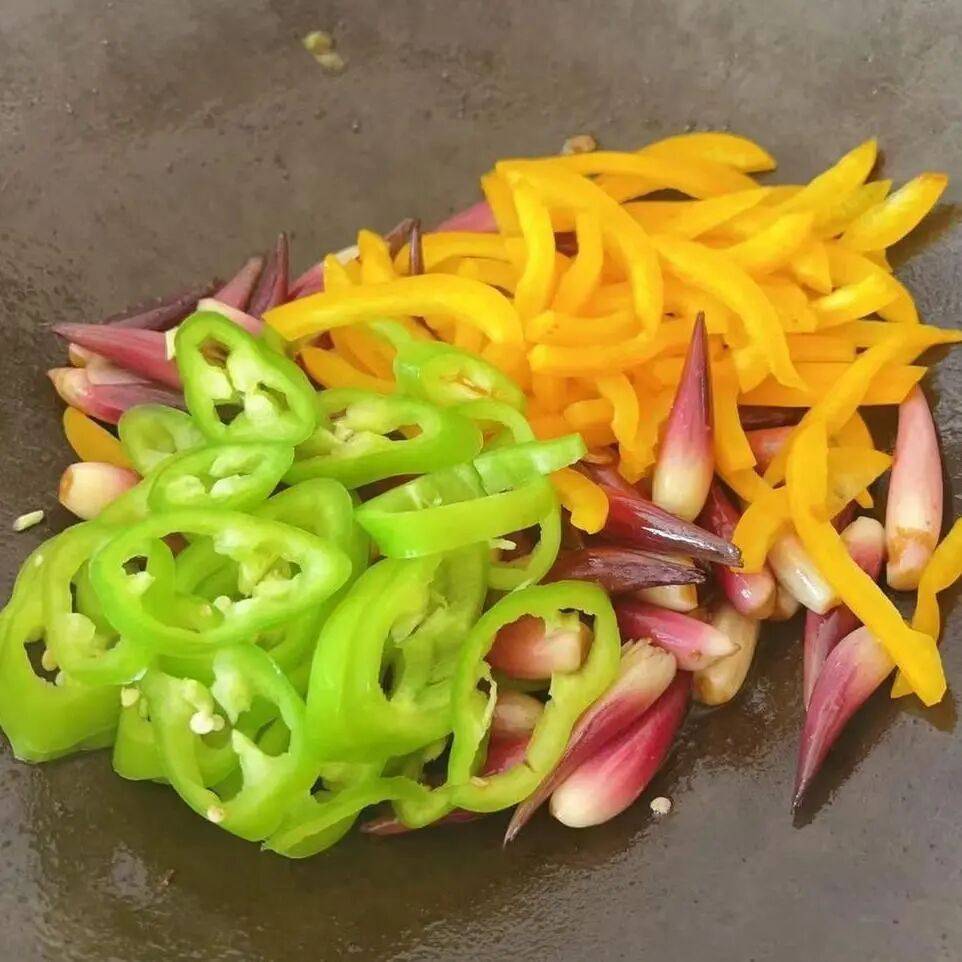 4. 在起锅前加入切好的彩椒,炝锅1分钟,加入适量盐和味素调味后,即可装盘。