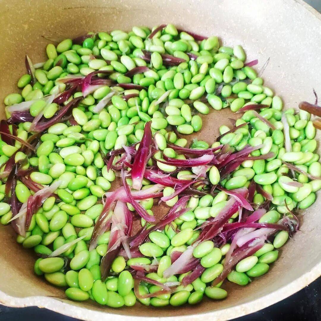 3. 接着放入毛豆,当毛豆变成碧绿色时,淋上少许开水,盖上锅盖焖煮2 - 3分钟,加入少许盐调味。