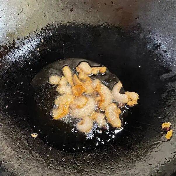 3. 在冷锅中倒入少许油,开小火将肥肉煸炒出油。